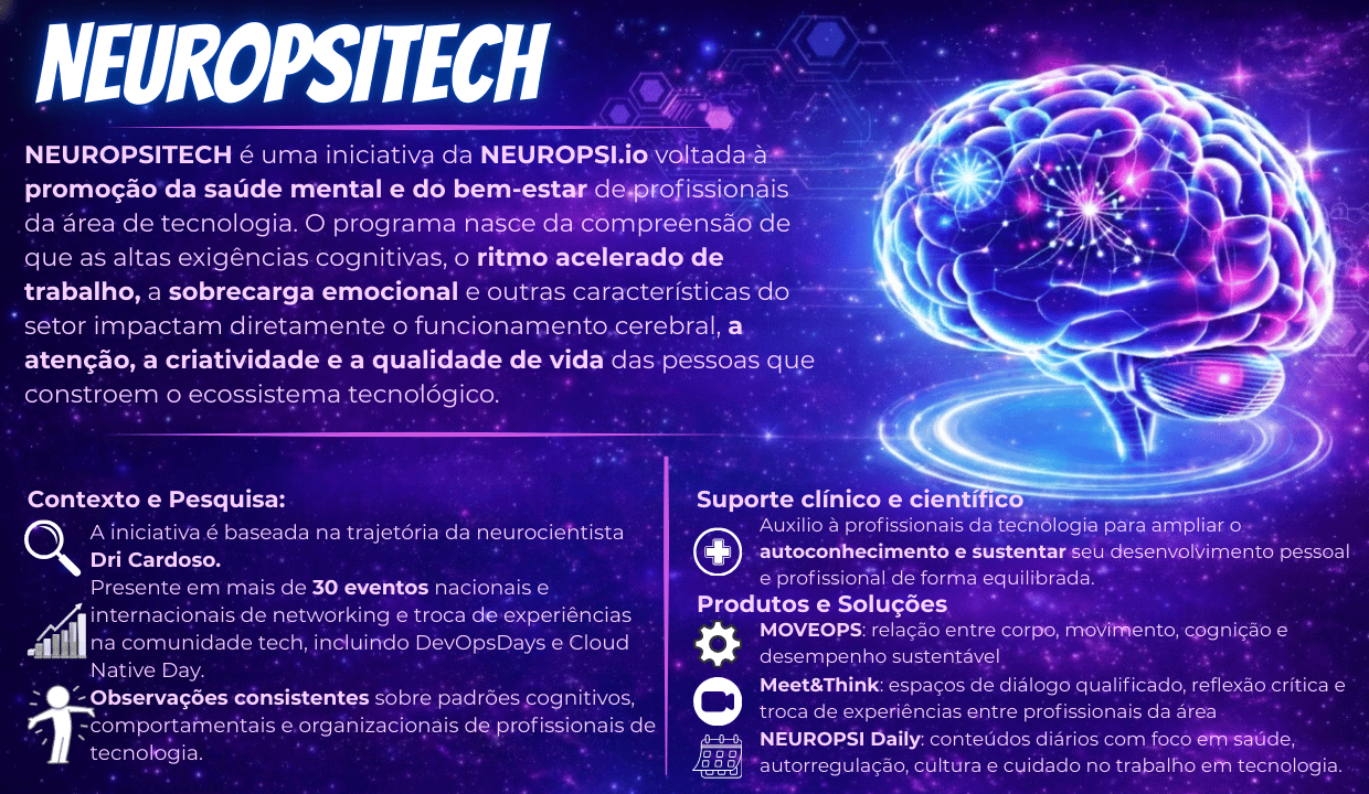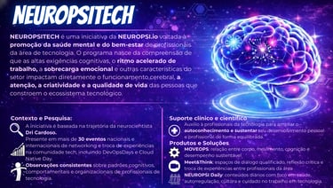 O NEUROPSI Meet&Think é um ciclo estruturado de encontros e eventos voltado ao ecossistema de tecnologia, criado para promover diálogo qualificado e produção coletiva de conhecimento sobre neurociência, saúde e organização do trabalho em contextos de alta demanda neurocognitiva. Por meio de talks e painéis conduzidos pela NEUROPSI.io, o projeto aborda temas como desempenho sustentável, bem-estar, ética no trabalho tecnológico, práticas de cuidado em ambientes de inovação e neurodiversidade. Integrado às campanhas mensais de saúde do NEUROPSITECH, o NEUROPSI Meet&Think cria um espaço seguro de escuta, reflexão crítica e troca de experiências entre profissionais e lideranças técnicas de TI.